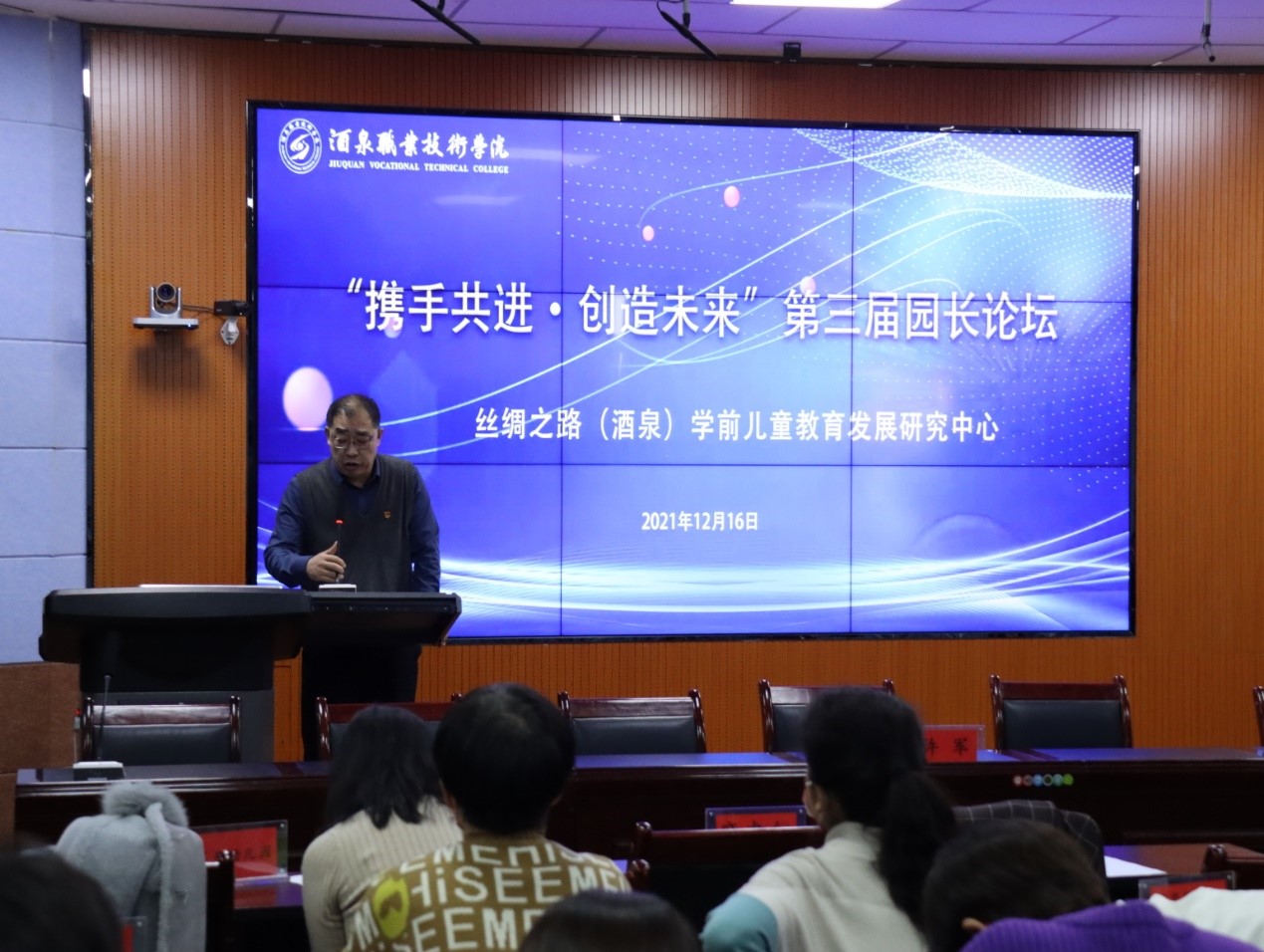 12月16日下午,丝绸之路(酒泉)学前儿童教育发展研究中心“携手共进·创造未来”第三届园长论坛暨教育与艺术学院2022届毕业生酒嘉专场招聘会在经世楼录播室举行。酒泉职业技术学院党委委员、副校长许军、酒嘉地区39名幼儿园园长及教育与艺术学院部分师生代表参加了此次会议,会议由教育与艺术学院党支部书记、院长赵多生主持。