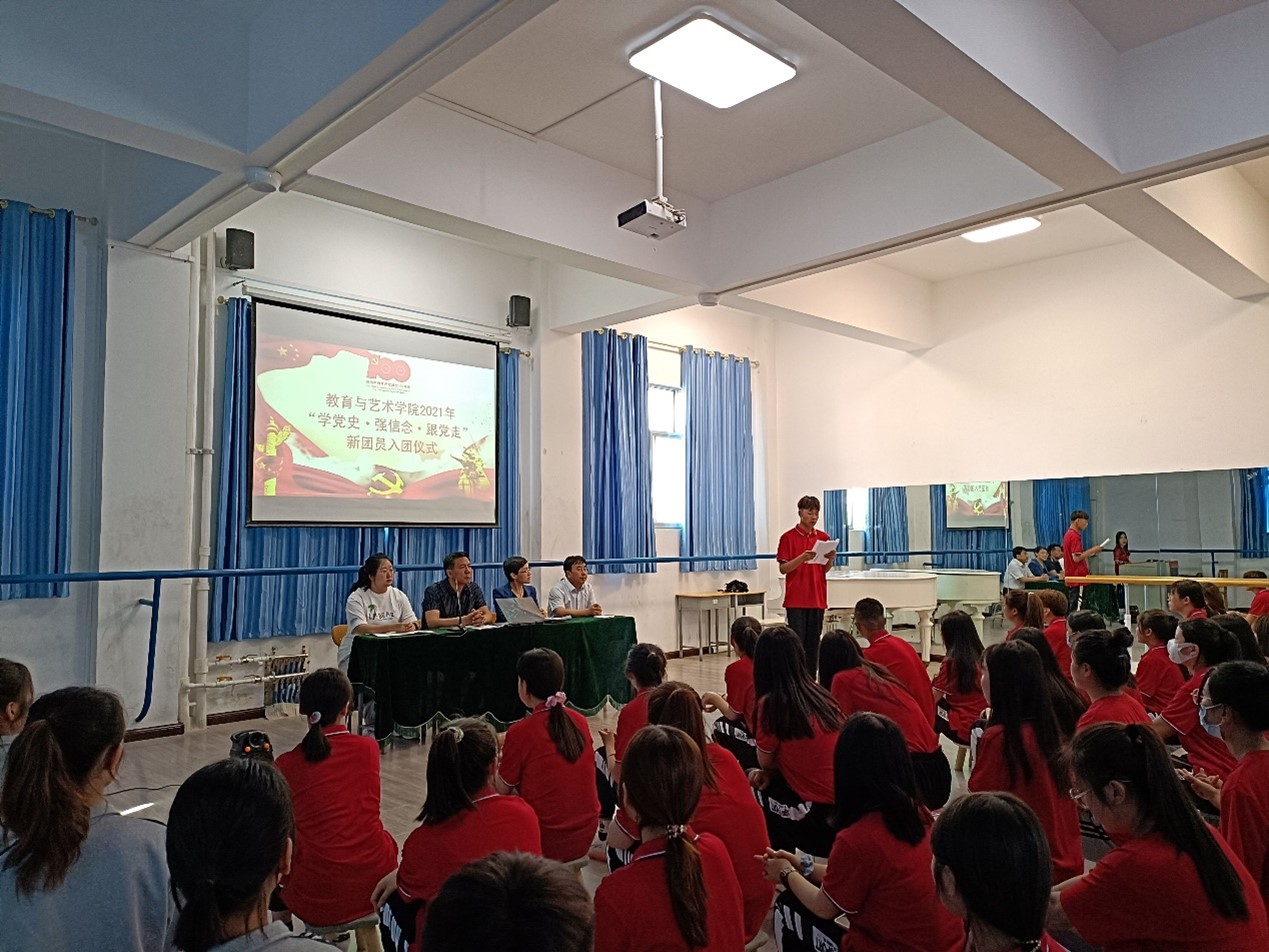 为引导和激励青年学生在新时代继承和发扬团员精神,增强广大团员青年政治意识、组织意识和模范意识,推动我院共青团工作再上新台阶。根据酒泉职业技术学院团委《关于开展2021年度新团员入团仪式工作的通知》,教育与艺术学院于5月20日4: 50在明德楼101举行“学党史·强信念·跟党走”新团员入团仪式。出席仪式的有党支部书记、院长舒志华、党支部副书记王瑜珲、梁志红副院长、团委书记袁霓,及4名新团员和129名入团积极分子。