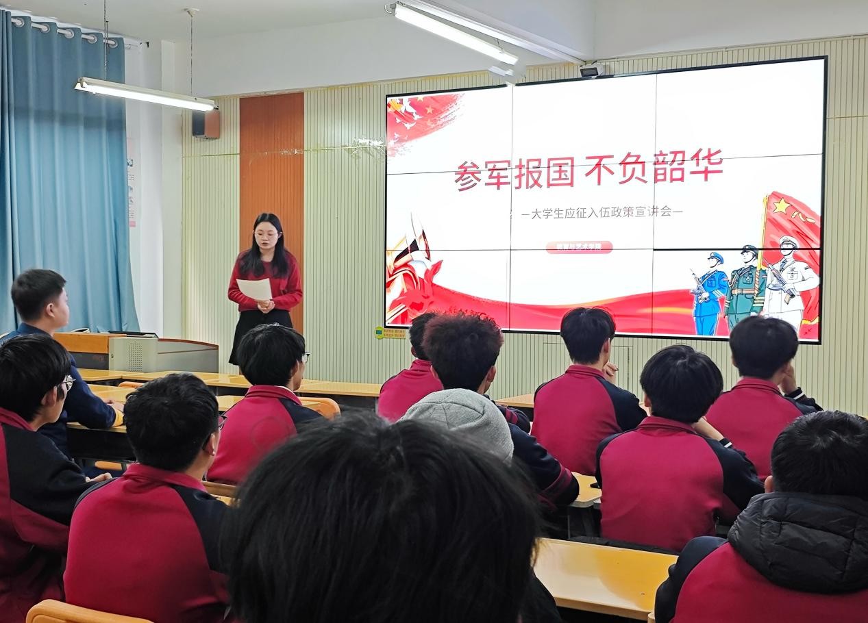 为进一步厚植青年学子家国情怀,凝聚强军报国青春力量,扎实推动大学生征兵工作走深走实,12月30日,教育与艺术学院隆重举行“参军报国,不负韶华”2026年大学生应征入伍政策宣讲会,通过精准解读政策搭建沟通桥梁,引导广大青年学子将个人理想融入国家发展大局,主动投身国防和军队现代化建设。