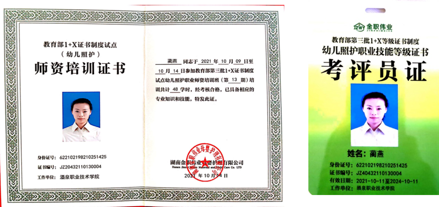 通过1+X证书标准引领,提高学前教育专业人才培养与市场需求之间的适应性、吻合度,将“1+X”证书制度试点列为年度教学重点工作,通过定期调度、过程考核、日常督导扎实推进试点工作。2021年10月,选派蔺燕老师赴长沙参加幼儿照护专业理论及实操技能培训,考取考评员资格和获得优秀培训教师,1+X证书制度试点项目(幼儿照护)考核站点审批通过,考核站点工作衔接全面启动,具备组织开展培训考试条件。