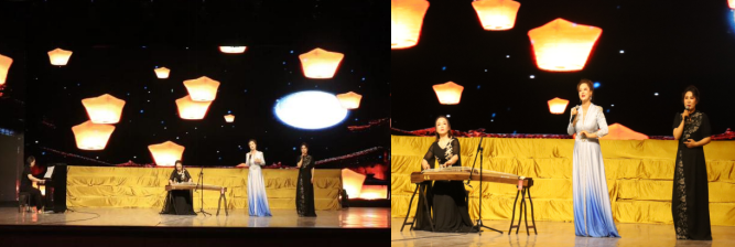 《青玉案·元夕》是由蒋文娟老师钢琴伴奏,于芳老师弹奏古筝,王婷老师、段晓燕老师共同演唱的曲目,钢琴声清脆响亮,古筝声抑扬顿挫,女声音色优柔飘渺,三种声音和谐地交织在一起,流入观众的心里。