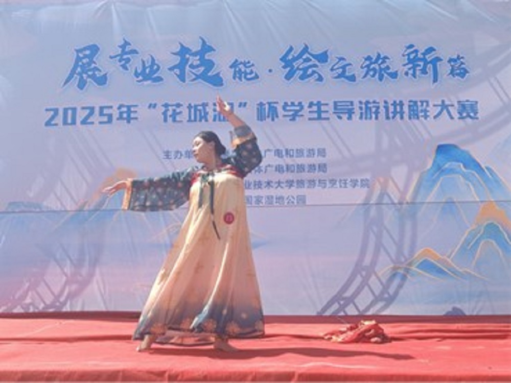 比赛环节精彩纷呈,选手们依次进行自选景点讲解、定点讲解和才艺运用讲解。在自选景点讲解中,选手化身 “丝路使者”,讲解甘肃省的景点景区、酒泉职业技术大学等,选手用细腻的语言与丰富的肢体动作,将地域文化娓娓道来;定点讲解环节,学生以花城湖风景区为讲解内容,凭借扎实的知识储备和灵活的临场应变能力,展现专业素养;才艺运用讲解更是亮点频出,舞蹈、诗歌朗诵、乐器演奏等才艺与讲解巧妙融合,为传统导游服务注入创新活力。