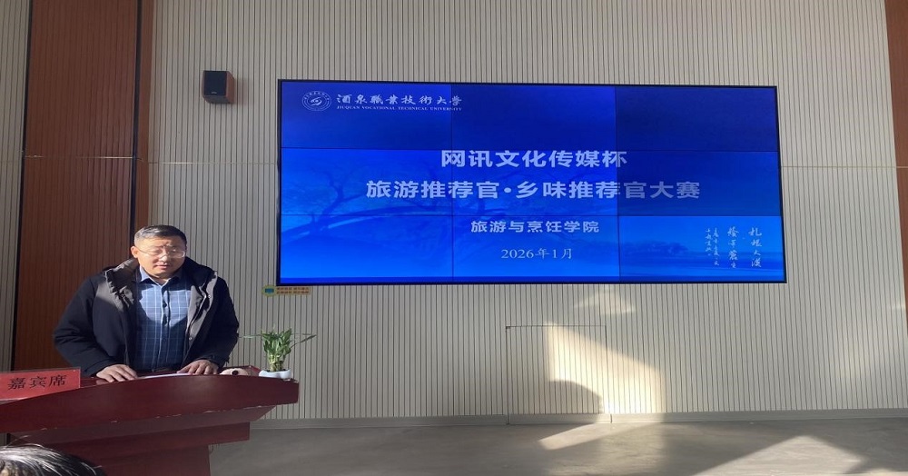 为深化产教融合,激发创新思维,锤炼实践能力,2026年1月6日旅游与烹饪学院举办“网讯文化传媒杯”旅游推荐官·乡味推荐官大赛。本次大赛得到了甘肃网讯文化传媒有限公司董事长刘玮琥先生的大力支持。大赛经过初赛共有十四名选手脱颖而出,在本次决赛中同台竞技,学院党支部副书记、院长刘兴龙、班子成员及旅游管理、研学旅行管理与服务专业的教师及2023级旅游管理班、研学旅行管理与服务班的同学观看了本次比赛。
