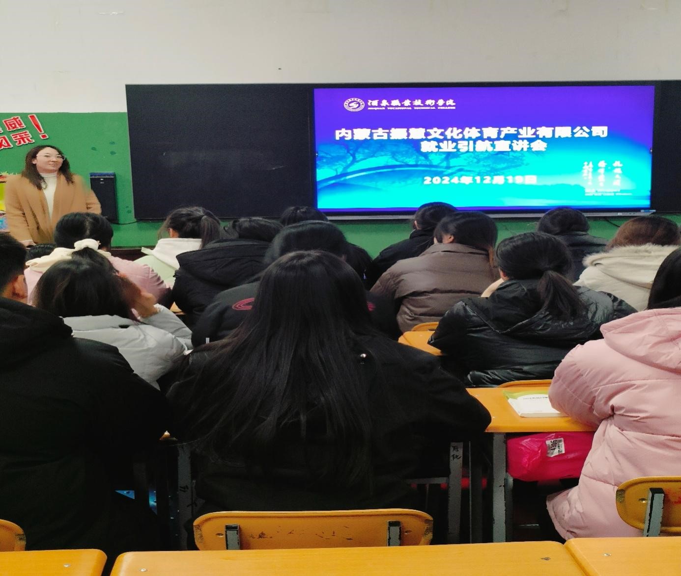 为加快推进学院2025届毕业生高质量就业, 12月19日下午,内蒙古振慧文化体育产业有限公司在我院体育馆开展2025年招聘宣讲会,让2025届毕业生了解了现阶段健身行业的发展状况和该企业用人需求及企业发展方向。
