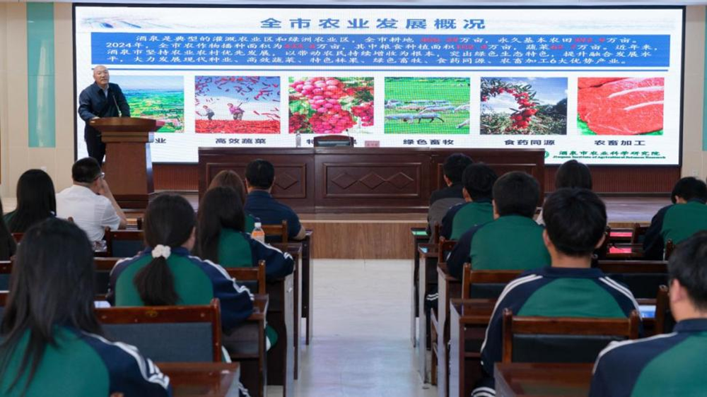 揭牌仪式结束后,米兴旺书记作了题为《酒泉现代农业的创新实践》的专题报告。他重点解析了酒泉市现代制种、高效蔬菜、特色林果、绿色畜牧、食药同源、农畜加工六大重点产业发展现状,深入介绍了酒泉市农科院对戈壁农业的创新实践,既有理论高度又有实践指导意义。专题报告极大地提升了师生对现代农业研究的系统性认知,深刻启发了专业教师如何将学术成果转化为解决生产难题的路径。