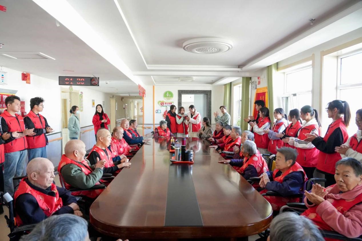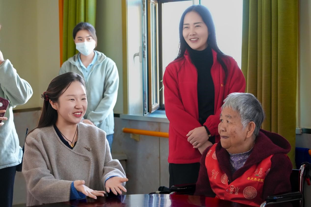 在春光养老院,大部分老人属于失能群体,日常生活难以自理,部分老人更长期面临失禁等困境。然而,正是在这样的环境中,生命的韧性与温情依然熠熠生辉。一对年过九旬的夫妻相伴于此,他们执手共度漫长岁月的画面,成为院中一道动人的风景;更有一位无法正常言语的老奶奶,每当旋律响起,便能以清澈悠扬的歌声表达对生活的挚爱,令在场学子无不动容。