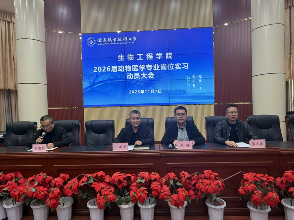为进一步深化高技能人才培养,强化学生实践教学环节,保障岗位实习工作有序推进。2025年11月7日下午,生物工程学院在逸夫报告厅组织召开2023级动物医学专业岗位实习动员大会。学院领导、畜牧兽医系全体教师及2023级动物医学1、2班94名学生参加会议。会议由畜牧兽医系主任张建明主持。