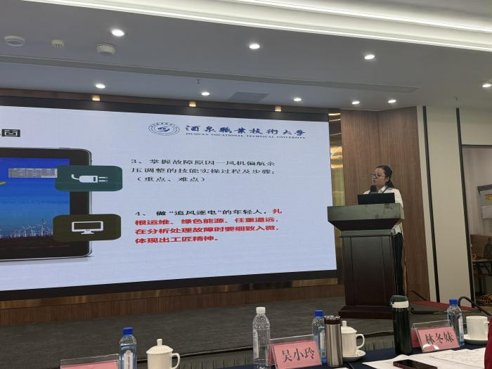 新能源工程学院教师代表张永婷聚焦课程核心教学内容,进行了教学展示,通过具象化的操作演示与案例分析,将“风力发电机组偏航余压调节”的专业技能与工匠精神、安全规范等思政元素有机融合,展现了“知行合一”的教学特色。