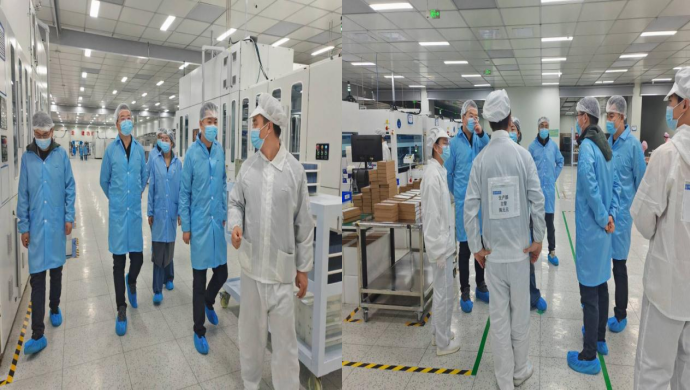 在甘肃金刚光伏有限公司的生产车间内,新能源工程学院张康、张云鹏院长带领光伏教研室教师,跟随企业技术人员实地考察异质结电池生产线。调研团队身着洁净服,细致了解硅片加工、电池片制备等核心工艺环节,近距离感受行业前沿的智能制造技术,为后续校企合作、人才培养对接积累一线实践素材。
