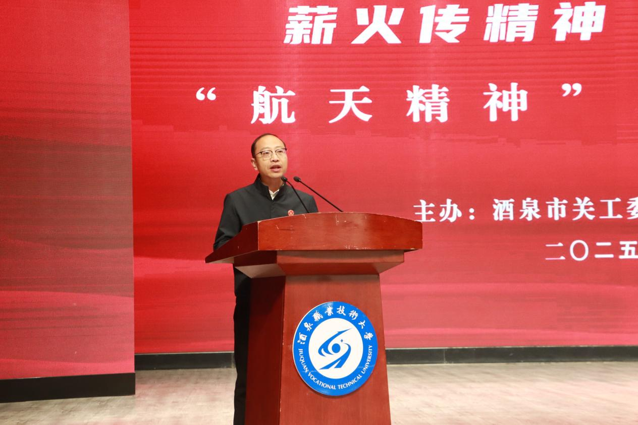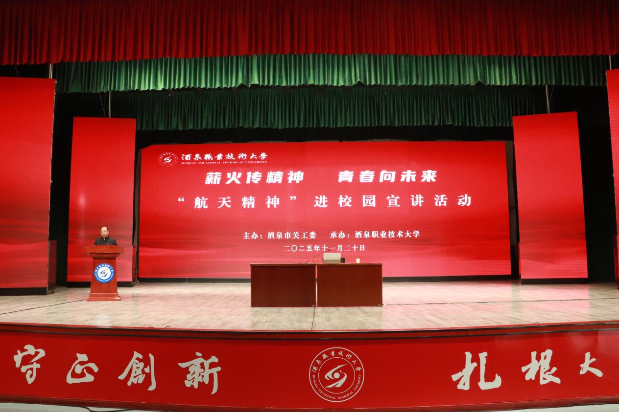 为深入学习贯彻习近平新时代中国特色社会主义思想,大力弘扬以“自主创新、艰苦奋斗、大力协同、无私奉献”为核心的新时代航天精神。2025年11月20日,由酒泉市关心下一代工作委员会办公室主办,学校承办的“薪火传精神 青春向未来--‘航天精神’进校园宣讲活动”在胡杨活动中心举行。学校党委委员、副校长高翔出席并主持活动。各学院学生管理副院长、全体辅导员及500余名学生代表齐聚一堂,共同聆听了这场内涵丰富、鼓舞人心的精神盛宴。