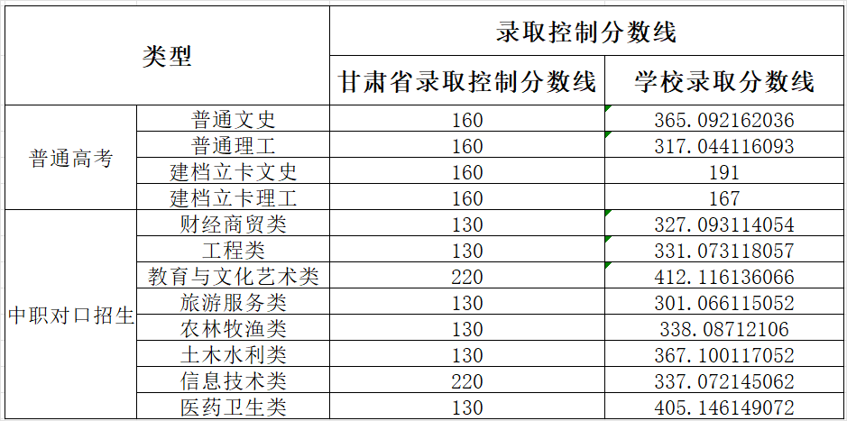 酒泉职业技术学院2023年甘肃省招生录取控制分数线